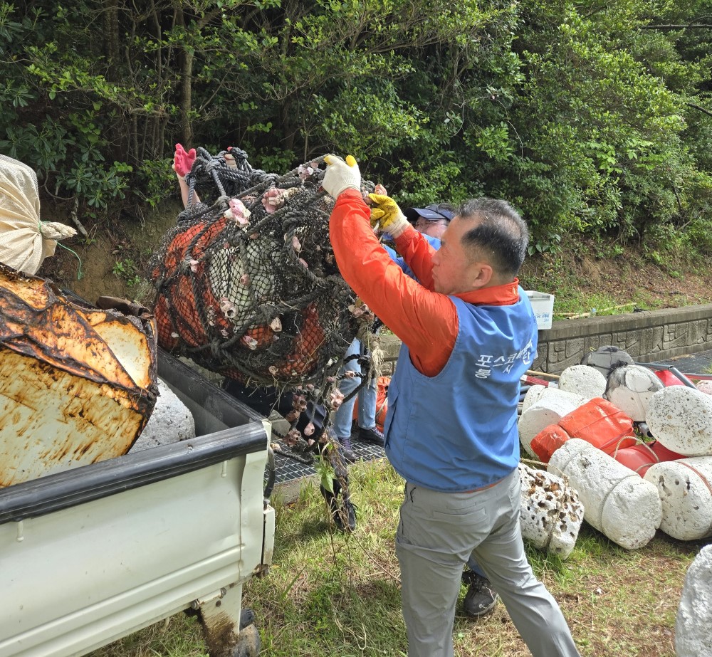 참여 직원들은 바닥에 널려 있거나 엉켜 있는 폐그물을 분리해 묶고, 크고 무거운 어구류는 협력해 들거나 끌어냈다.